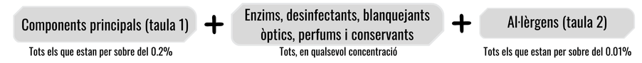 A més, els enzims, desinfectants, blanquejants òptics i perfums han de figurar sempre, estiguin a la concentració que estiguin. I també els conservants (amb la nomenclatura INCI).