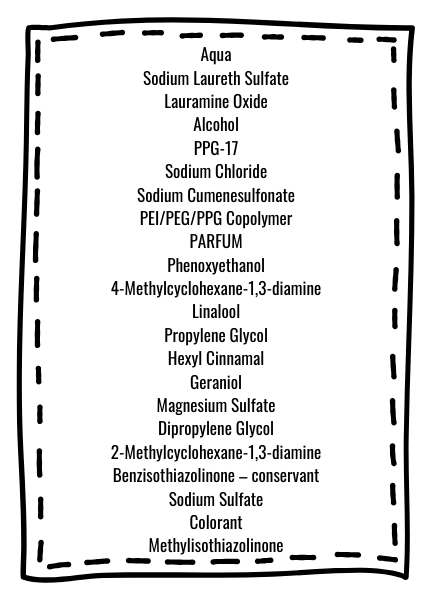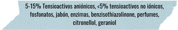 És un producte de neteja basat amb tensioactius aniònics i no iònics. Conté 3 conservants diferents (benzisothiazolinone, methylisothiazolinone, phenoxyethanol). L’olor l’aporta el perfum que fa aparèixer 3 al·lèrgens, que segur, estaran per sobre el 0,01% (geraniol, hexyl cinnamal, linalool). Això no vol dir que no porti altres ingredients, com espessants, seqüestrants,… però si no estan en alguns del punts que hem comentat no es necessari indicar-ho. Per exemple, per l’aspecte d’aquesta formulació en podem deduir que més del 50% serà aigua, pel color que té portarà colorants i força ingredients més.